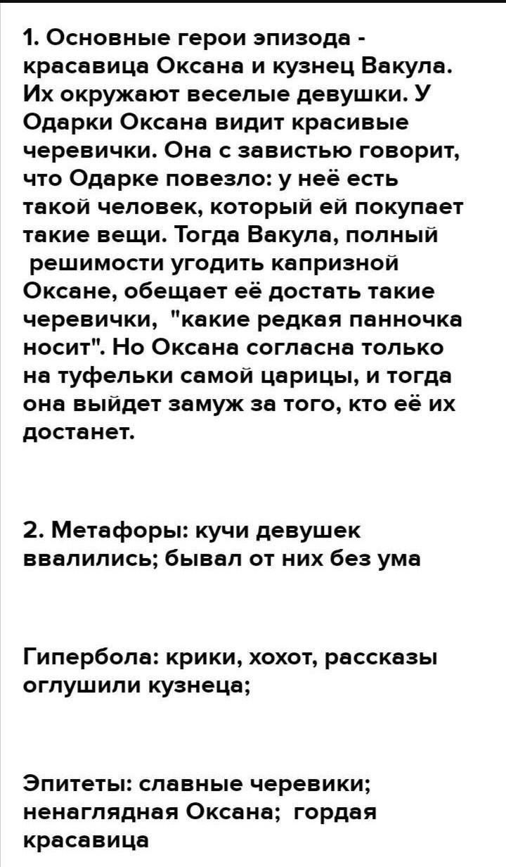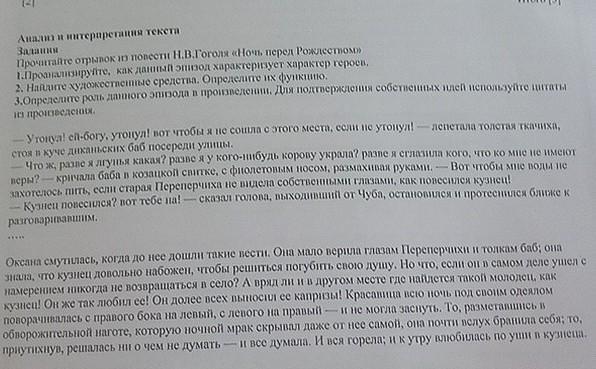 осуществилось? [2] Анализ и интерпретация текста Задания Итого (5) Прочитайте отрывок из повести Н.В.Гоголя «Ночь перед Рождеством» 1.Проанализируйте, как данный эпизод характеризует характер героев. 2. Найдите художественные средства. Определите их функцию. 3.Определите роль данного эпизода в произведении. Для подтверждения собственных идей используйте цитаты из произведения. лепетала толстая ткачиха, Утонул! ей-богу, утонул! вот чтобы я не сошла с этого места, если не утонул! стоя в куче диканьских баб посереди улицы. Вот чтобы мне воды не Что ж, разве я лгунья какая, разве я у кого-нибудь корову украла, разве я сглазила кого, что ко мне не имеют веры? кричала баба в козацкой свитке, с фиолетовым носом, размахивая руками. захотелось пить, если старая Переперчиха не видела собственными глазами, как повесился кузнец! сказал голова, выходивший от Чуба, остановился и протеснился ближе к Кузнец повесился? вот тебе на! разговаривавшим. Оксана смутилась, когда до нее дошли такие вести. Она мало верила глазам Переперчихи и толкам баб, она знала, что кузнец довольно набожен, чтобы решиться погубить свою душу. Но что, если он в самом деле ушел с намерением никогда не возвращаться в село? А вряд ли и в другом месте где найдется такой молодец, как кузнец! Он же так любил ее! Он долее всех выносил ее капризы! Красавица всю ночь под своим одеялом поворачивалась с правого бока на левый, с левого на правый и не могла заснуть. То, разметавшись в обворожительной наготе, которую ночной мрак скрывал даже от нее самой, она почти вслух бранила себя, то, и все думала. И вся горела, и к утру влюбилась по уши в кузнеца. приутихнув, решалась ни о чем не думать voyet Каки apry. Мен на Тя Т СРОЧНО