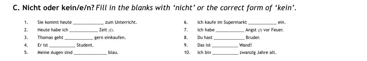 Nicht oder kein/e/n? Fill in the blanks with 'nicht' or the correct form of 'kein'.