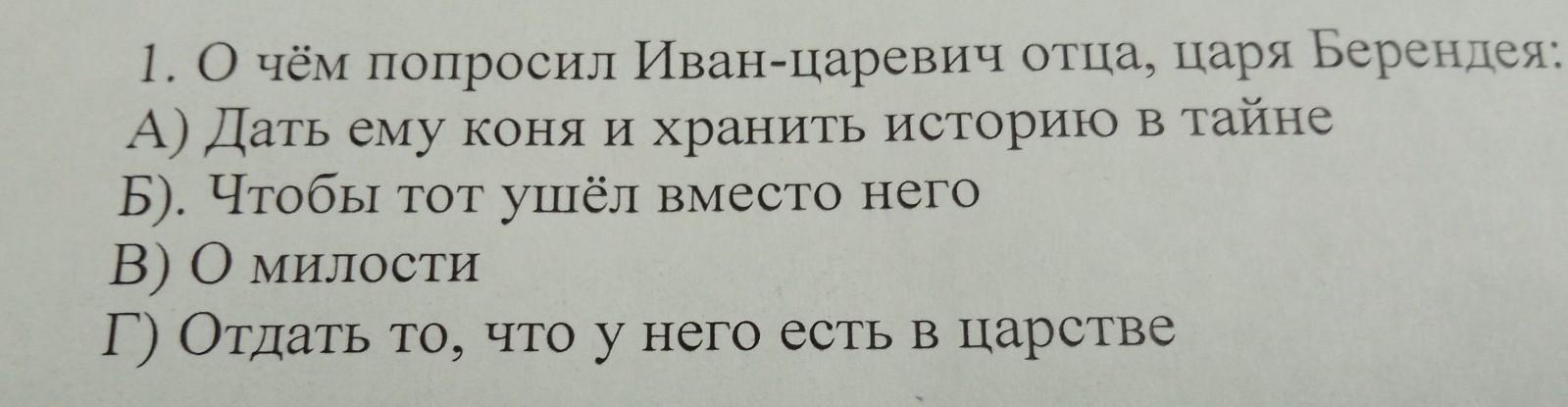 1. О чём попросил Иван-царевич отца, царя Берендея А) Дать ему коня и хранить историю в тайне Б). Чтобы тот ушёл вместо него В) О милости Г) Отдать то, что у него есть в царстве