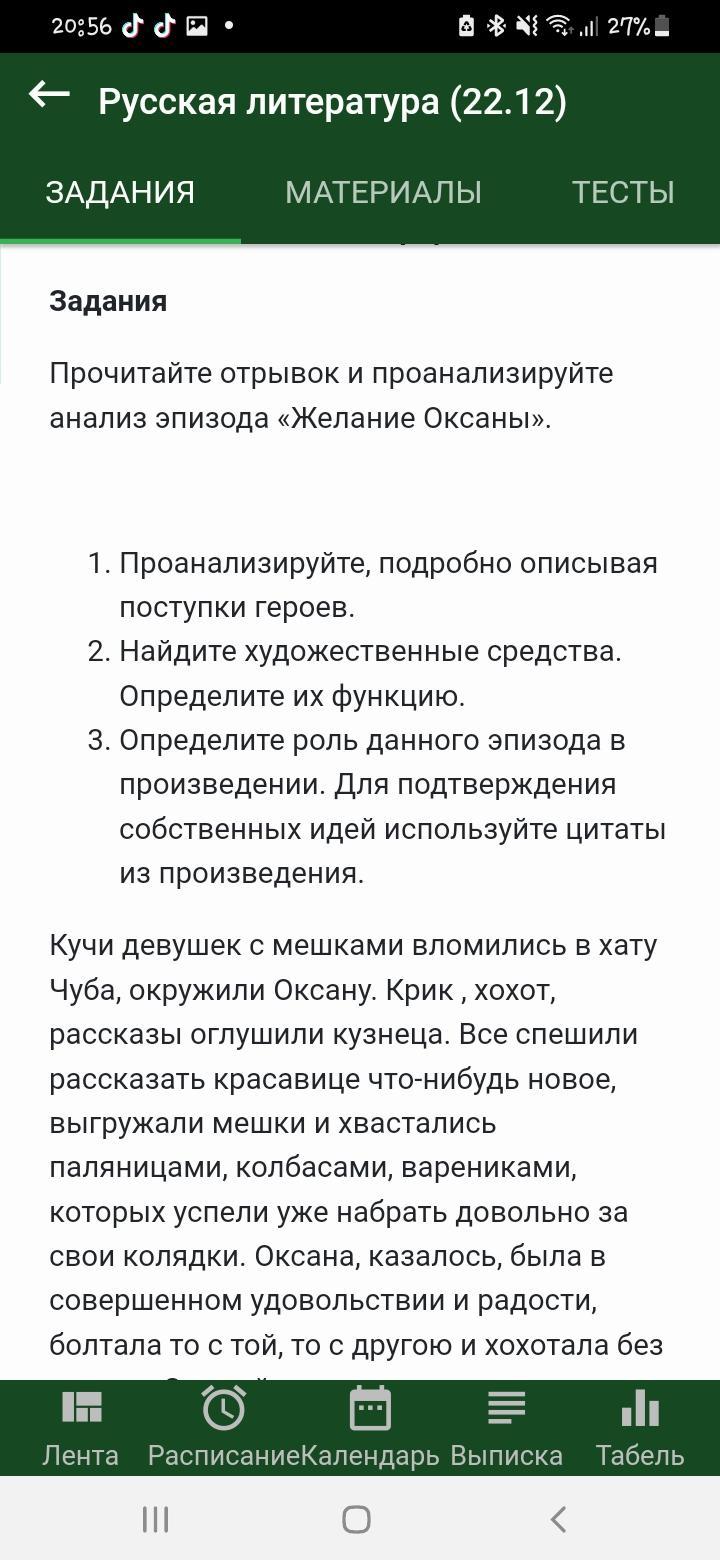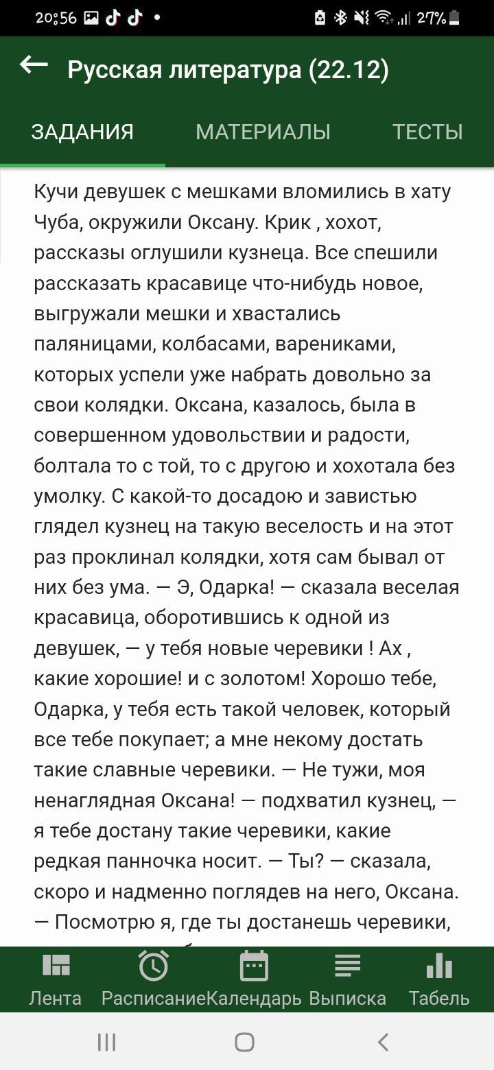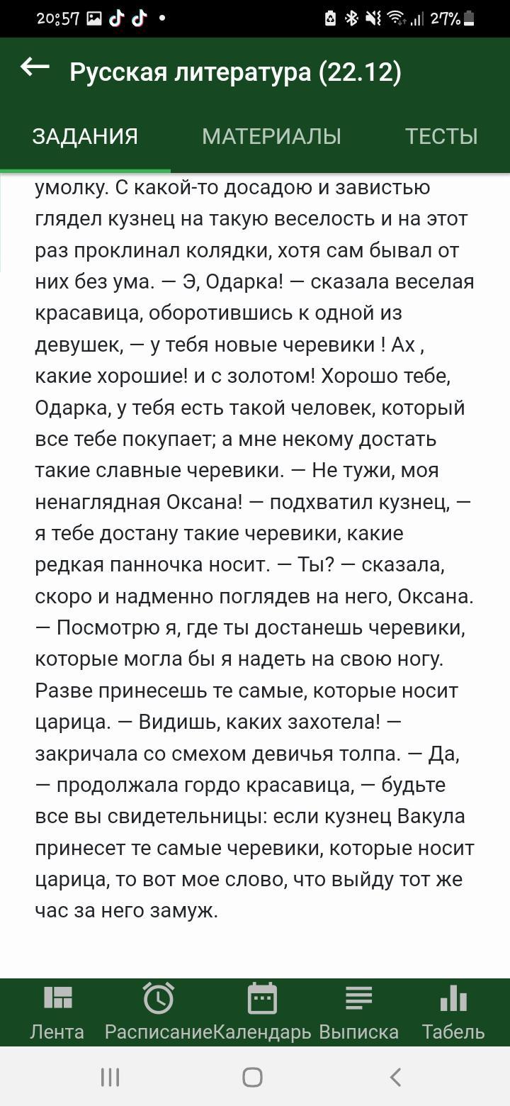 Ответ:1. Основные герои эпизода - красавица Оксана и кузнец Вакула. Их окружают веселые девушки. У Одарки Оксана видит красивые черевички. Она с завистью говорит, что Одарке повезло: у неё есть такой человек, который ей покупает такие вещи. Тогда Вакула, полный решимости угодить капризной Оксане, обещает её достать такие черевички, "какие редкая панночка носит". Но Оксана согласна только на туфельки самой царицы, и тогда она выйдет замуж за того, кто её их достанет.