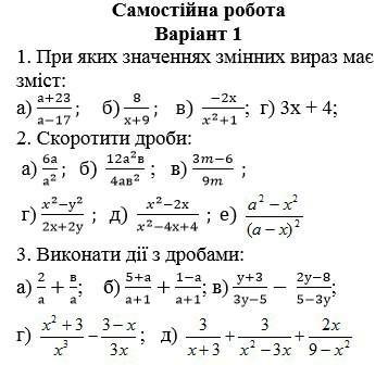 ПОМОГИТЕ СПОЧНОО ПОДАЛУЙСТА!!!!! Самостійна робота Варіант 1 1. При яких значеннях змiнних вираз має зміст: a+23 a-17 a) 2. Скоротити дроби: ба a) 6) ; В) 8 - 6) б)х19; в) ха; г) 3х + 4; x²+1 г) 12а2в 43B2 X x2-y2 г) ; д) 2x+2y ; e) 3. Виконати дії з дробами: 5+a 1-a у+3 a) 2 + + ; В): a+1 2+1 Зу-5 б) 3m-6 9m x² +3 3-x. 3x x2-2x x2-4х+4 3 x+3 ; + a²-x² (a-x)2 2y-8. 5-3y' 3 2x + x²-3x 9-x²