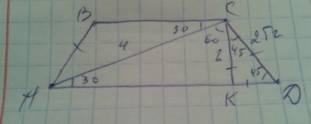 Найдите углы равнобокой трапеции, если её боковая сторона равна 2 см, а диагональ 4 см, образует с осонованием угол в 30 градусах.