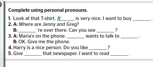 Complete using personal pronouns. 1. Look at that T-shirt. It 2. A: Where are Jenny and Greg? B: 3. A: Maria's on the phone. B: OK. Give me the phone. is very nice. I want to buy 're over there. Can you see ? wants to talk to 4. Harry is a nice person. Do you like 5. Give ? that newspaper. I want to read