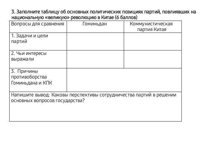 3. Заполните таблицу об основных политических позициях партий, повлиявших на национальную «великую>> революцию в Китае .Вопросы для сравнения Гоминьдан 1. Задачи и цели партий 2. Чьи интересы выражали 3. Причины противоборства Гоминьдана и КПК Коммунистическая партия Китая Напишите вывод: Каковы перспективы сотрудничества партий в решении основных вопросов государства?