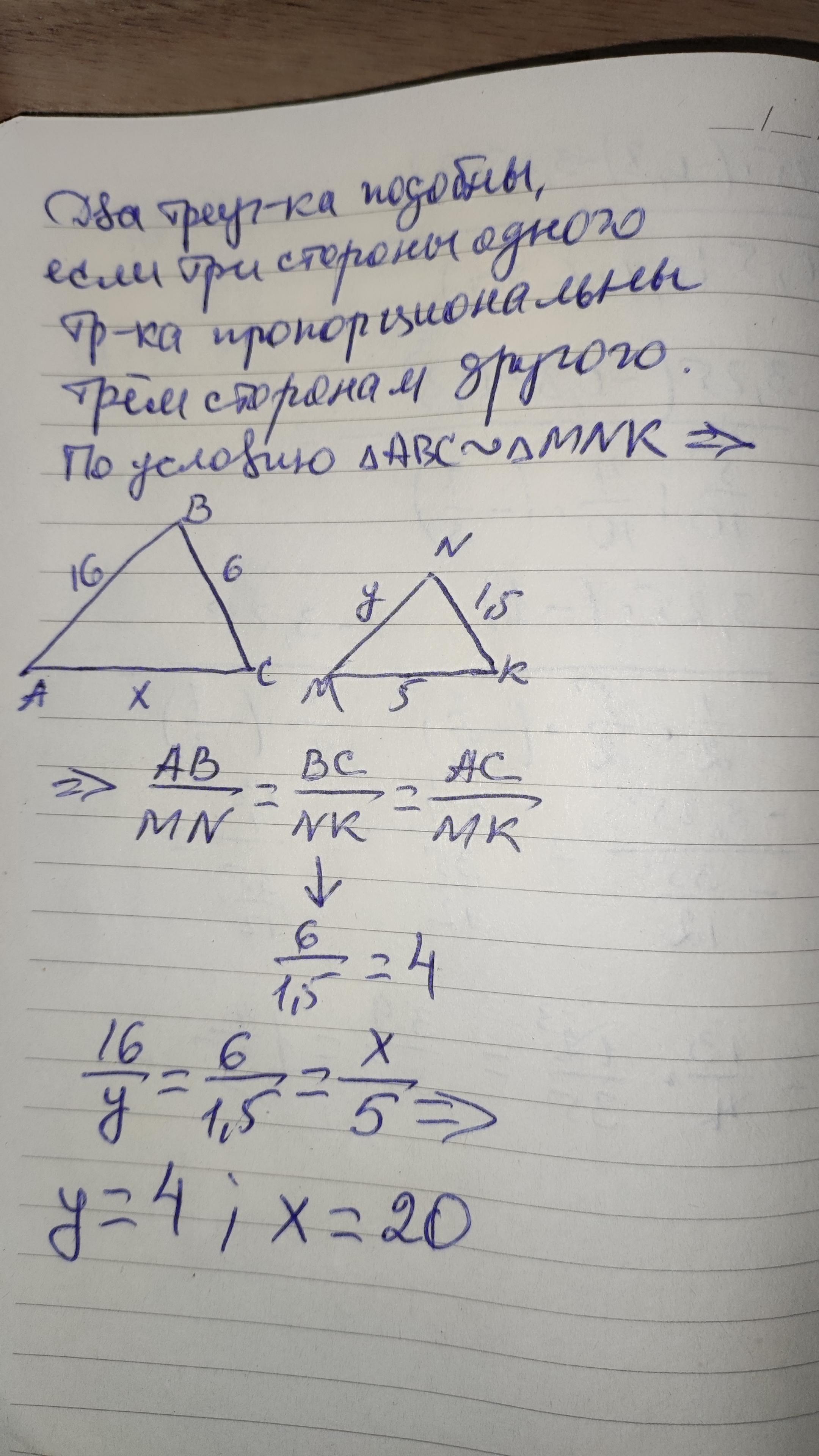 спочатку знаходимо коефіцієнт подібності (ділимо більшу сторону на меншу відповідну їй). ВС:NК=6:1,5=4, отже k=4. тоді сторона АВ у 4 рази більше MN, і АС у 4 рази більше МК. MN=16:4=4 см, АС=5*4=20 см.