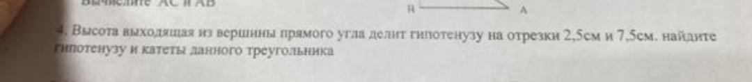 Н 4. Высота выходящая из вершины прямого угла делит гипотенузу на отрезки 2,5см и 7.5см. найдите гипотенузу и катеты данного треугольника