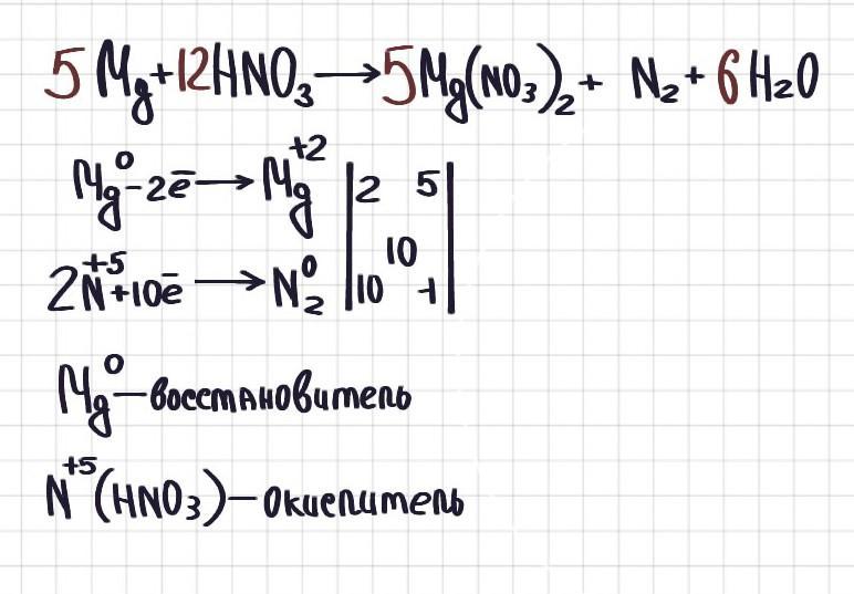 Вивести електронний баланс , урiвняти коефіцієнти , вказати окисник та відновник Mg + HNO3- > Mg ( NO3 ) 2 + N2 + H20