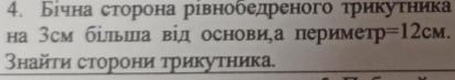 бічна сторона рівнобедреного трикутника на 3см більша від основи а периметр=12 знайти сторони трикутника