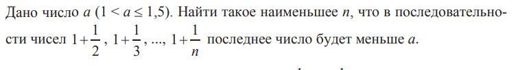 Этот код считывает значение a со стандартного ввода, затем инициализирует сумму 1 и счетчик n 1. Затем он входит в цикл, который продолжается до тех пор, пока сумма не станет меньше a. Внутри цикла он увеличивает n и прибавляет 1/n к сумме. Когда сумма становится меньше a, цикл завершается, и конечное значение n выводится на стандартный вывод.