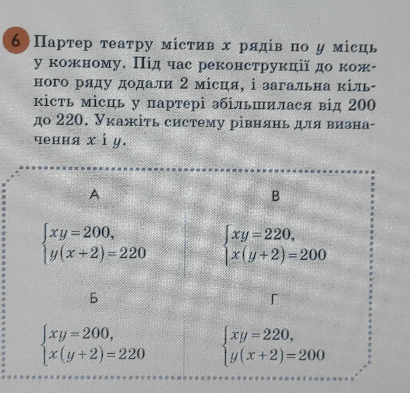 верный ответ Б): чтобы найти общее количество первоначальных мест в партере, нужно количество мест в одном ряду, т.е. у умножить на количество рядов х. получим ху, общее количество мест первоначально составляло 200, поэтому первое уравнение системы ху=200, когда количество мест в каждом ряду увеличили на 2, их стало (у+2), а во всех рядах х*(у+2), общее же количество мест стало равным 220, поэтому второе уравнение системы х*(у+2)=220