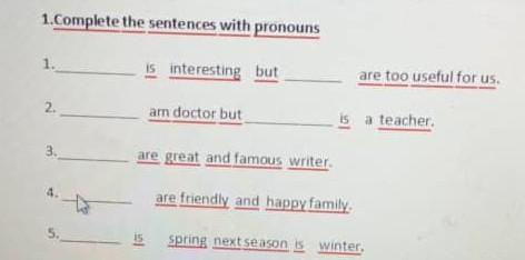 Я не совсем понимаю тк нет объяснения к заданию, но думаю ,что правильно : 1 she’s interesting but you’re useful for us too, 2 I’m a doctor but he’s a teacher, 3 you’re a great and famous writer, 4 we are friendly and happy family, 5 spring is now next season is winter