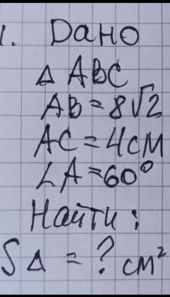 S(ΔABC)=AB*AC*sin∡A/2 =8√2*4*√3/2/2 =8√6 cm²