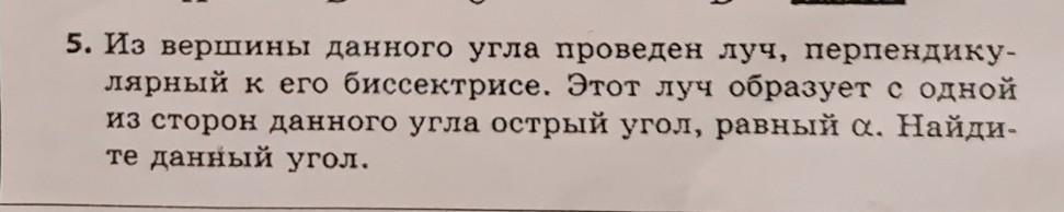5. Из вершины данного угла проведен луч, перпендику- лярный к его биссектрисе. Этот луч образует с одной из сторон данного угла острый угол, равный с. Найди- те данный угол.