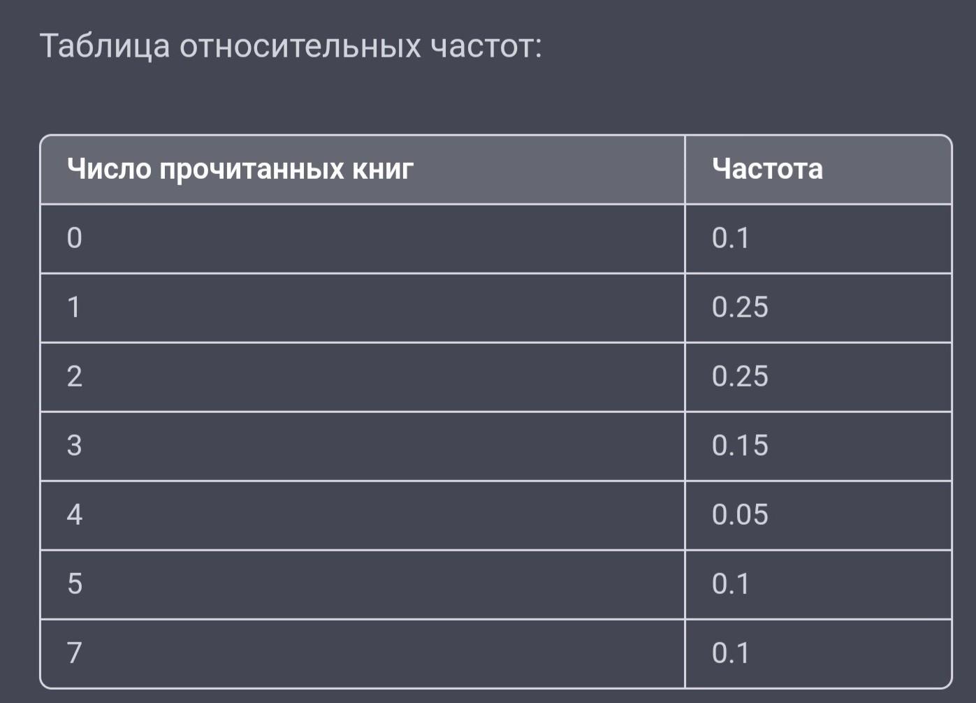 в) Чтобы проверить таблицу относительных частот, нужно убедиться, что сумма всех частот равна 1. В данной таблице сумма частот равна 1, поэтому таблица относительных частот верна. также непротиворечивость верна