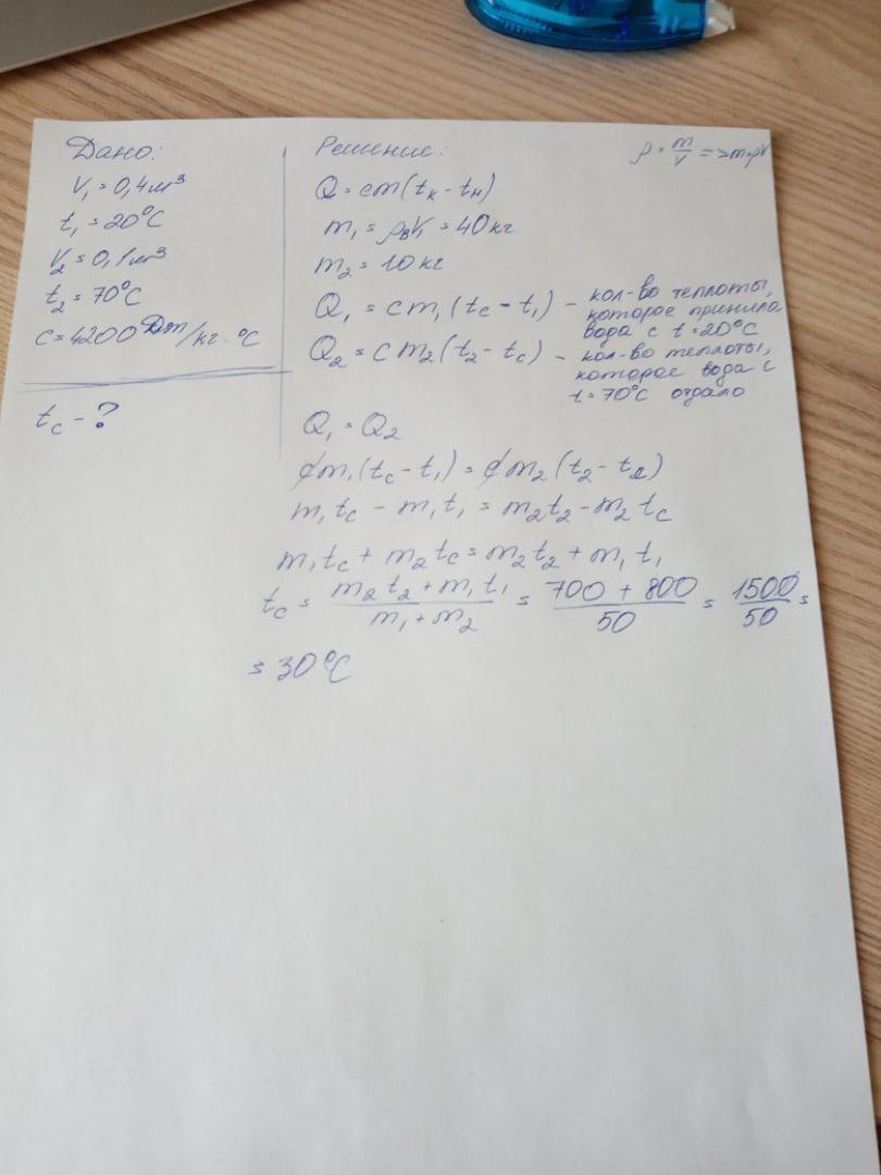 Смешали 0,4 м3 воды при температуре 20 °С и 0,1 м3 воды при температуре 70 °С. Какова температура смеси при тепловом равновесии? Удельная теплоемкость воды равна 4200 Дж/(кг• °C).