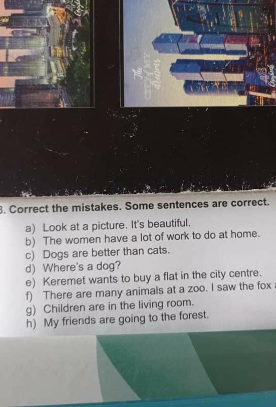 Correct the mistakes. Some sentences are correc a) Look at a picture. It's beautiful. b) The women have a lot of work to do at home. c) Dogs are better than cats. d) Where's a dog? e) Keremet wants to buy a flat in the city centre. f) There are many animals at a zoo. I saw the fo g) Children are in the living room. h) My friends are going to the forest.