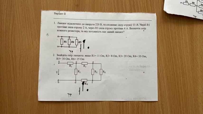 Ланцюг підключено до напруги 220 В, та споживає силу струму 11 А. Через RI протікає сила струму 2 А, через R3 сила струму протікає 4 А. Визначте опір кожного резистора, та яку потужність має даний ланцюг,