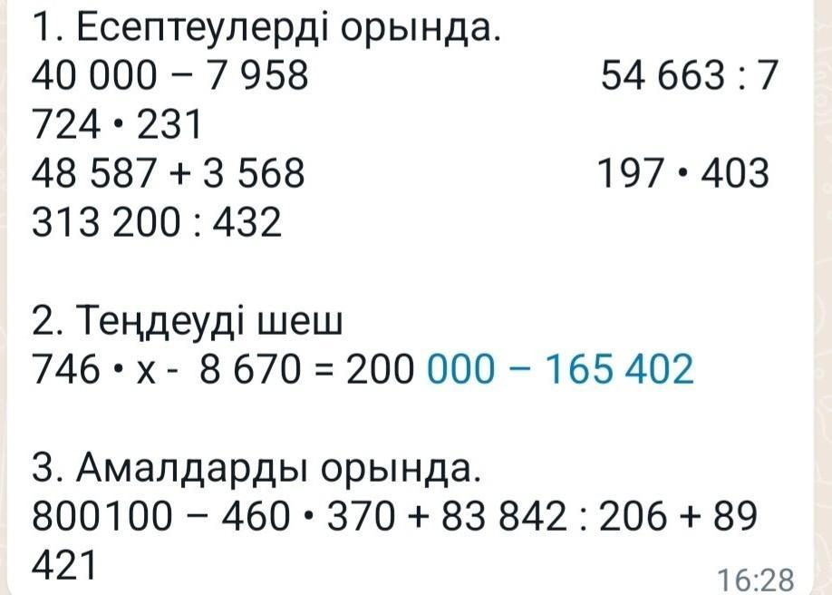 1. Есептеулерді орында. 40 000 – 7 958 54 663 : 7 724 • 231 48 587 + 3 568 197 • 403 313 200 : 432 2. Теңдеуді шеш 746 • х - 8 670 = 200 000 – 165 402 3. Амалдарды орында. 800 100 – 460 • 370 + 83 842 : 206 + 89 421