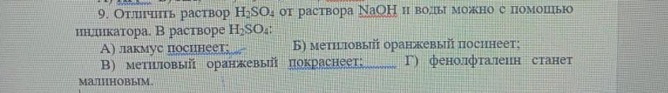 9. Отличить раствор H2SO, от раствора NaOH и воды можно с помощью индикатора. В растворе H2SO4 А) лакмус поспнеет: Б) метиловый оранжевый посинеет: В) метиловый оранжевый покраснеет: малиновым. Г) фенолфталеин станет даю 30 балов