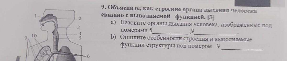 10 9. Объясните, как строение органа дыхания человека связано с выполняемой функцией. [3] а) Назовите органы дыхания человека, изображенные по номерами 5 ,9 b) Опишите особенности строения и выполняемые функции структуры под номером 9 даю 90баллов
