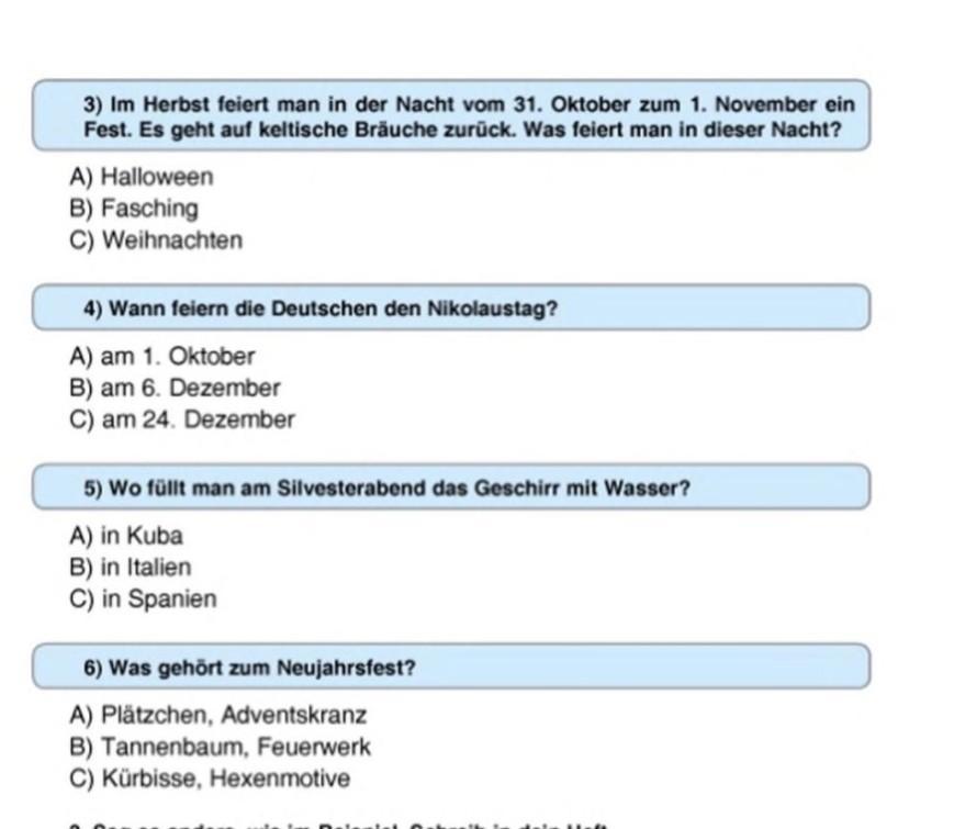 1) Welche drei Dinge machen das Wetter? A) Regen, Wind und Sonnenschein B) Sonne, Sand und Meer C) Wind, Wasser, Sonne 2) Eichhörnchen legen im Herbst ihren Wintervorrat an. Was sammeln sie besonders gern? A) Äpfel und Kartoffeln B) Nüsse und Eicheln C) Beeren und Blätter