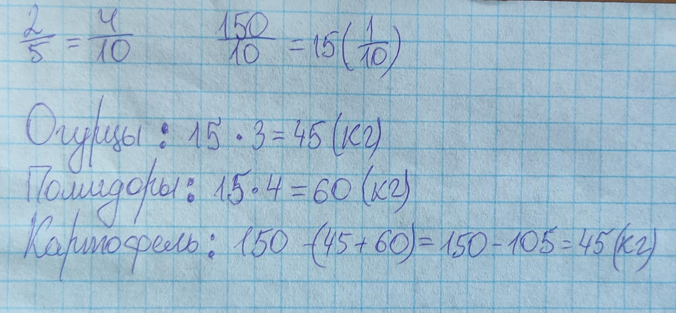 В магазин привезли 150 кг овощей. 3/10 составляют огурцы, 2/5 составляют помидоры, остальное-картофель. Сколько кг картофеля привезли в магазин?