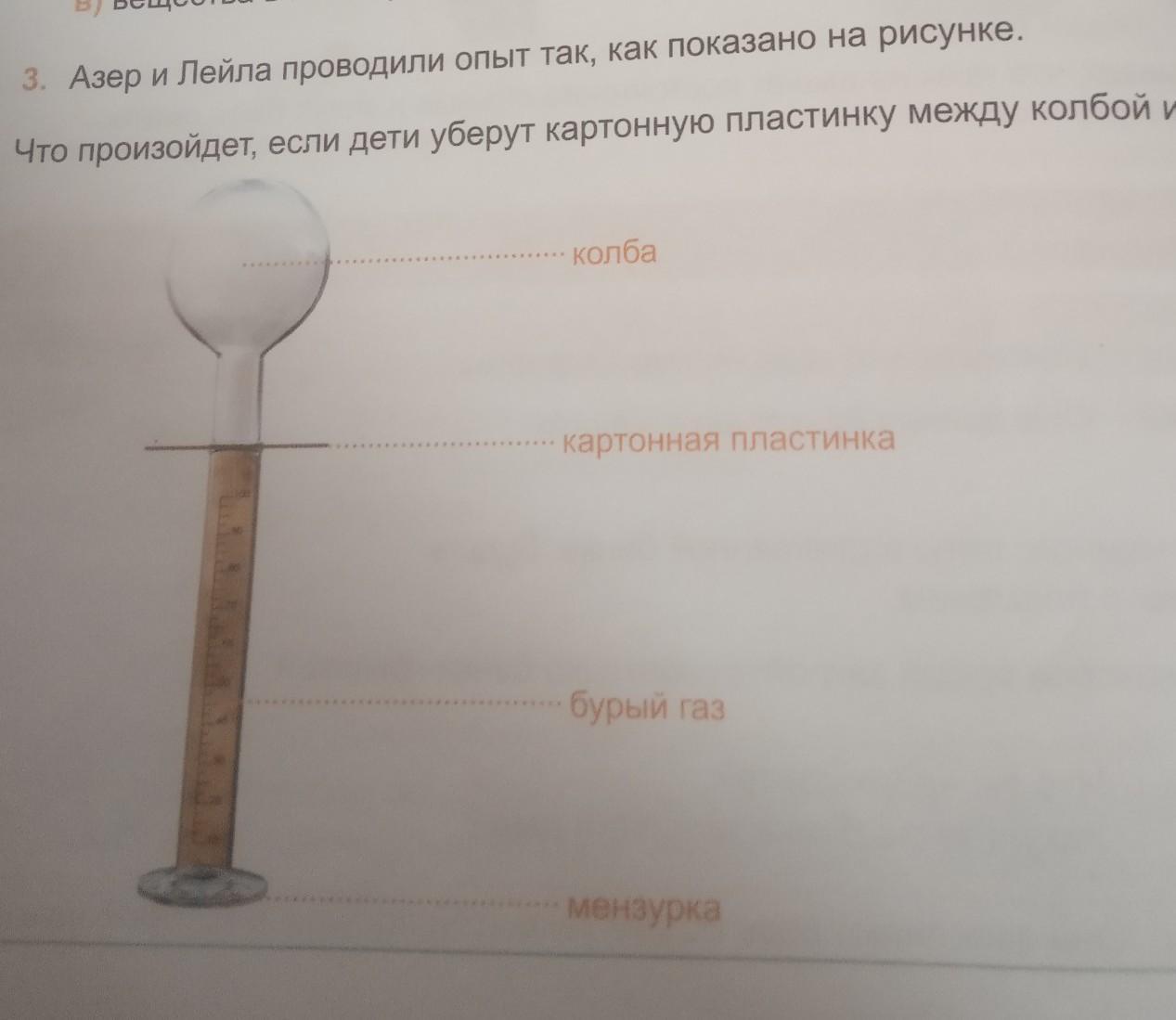 Азер или Лейла проводили опыт так как показано на рисунке. Что произойдёт если дети уберут картонную пластинку между колбой и мензуркой.
