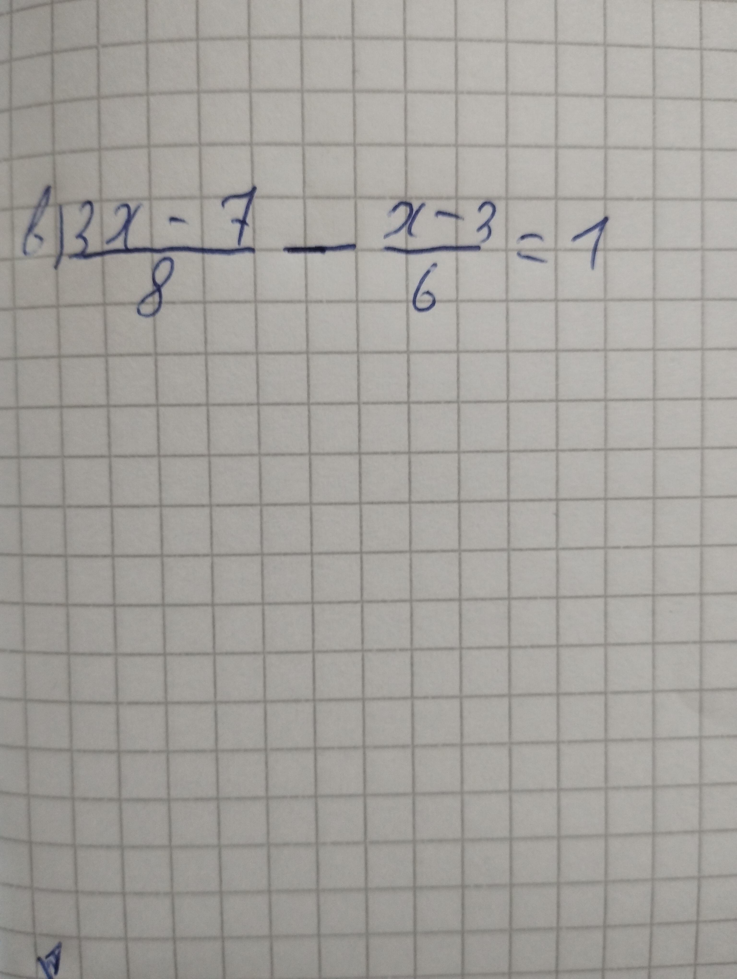 \frac{3x - 7}{8}  -  \frac{x - 3}{6}  = 1 \\  \frac{3x - 7}{8}  -  \frac{x - 3}{6}  - 1 = 0 \\  \frac{3(3x -7)}{24}  -  \frac{4(x - 3)}{24}  -  \frac{24}{24}  = 0 \\  \frac{9x - 21 - 4x  + 12 - 24}{24}  = 0 \\  \frac{5x - 33}{24}  = 0 \\ 5x - 33 = 0 \\ 5x = 33 \\ x =  \frac{33}{5}   \\ x = 6 \frac{3}{5}