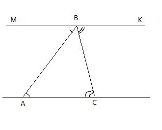 Через вершину B треугольника ABC провели прямую MK параллельную прямой AC угол MBA = 42 градусов угол CBK = 56 градусов Найдите углы треугольника ABC