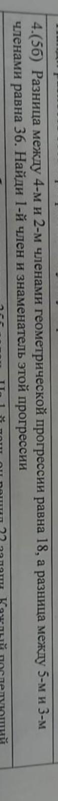 Разница между 4-м и 2-м членами геометрической прогрессии равна 18, а разница между 5-м и 3-м членами равна 36. Найди 1-й член и знаменатель этой прогрессии 1-й 22 ачи. Каждый по ледующий
