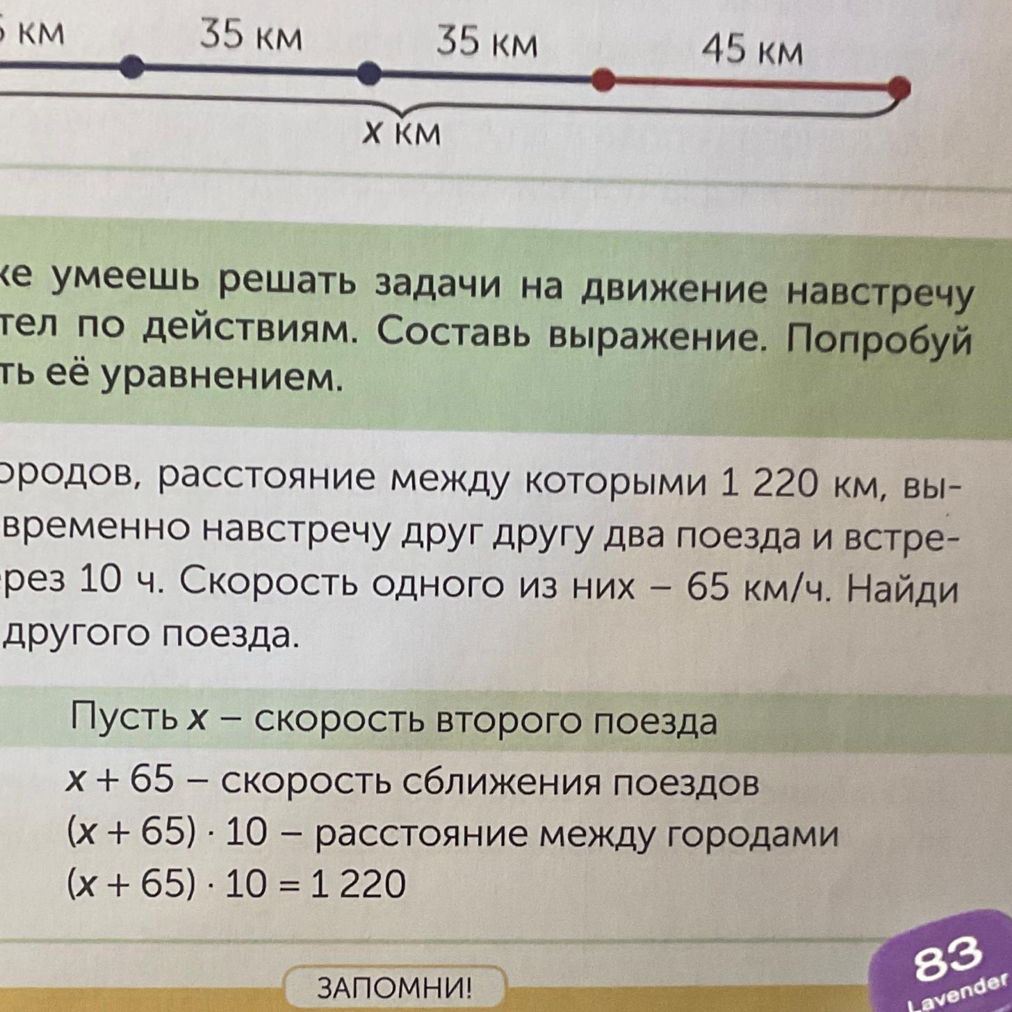 тились через 10 ч. Скорость одного из них - 65 км/ч. Найди