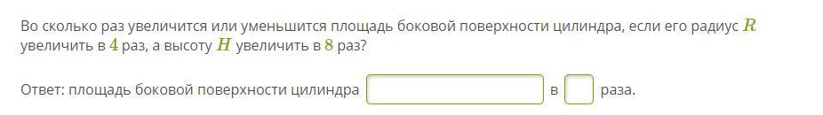 Во сколько раз увеличится или уменьшится площадь боковой поверхности цилиндра, если его радиус R увеличить в 4 раз, а высоту H увеличить в 8 раз?