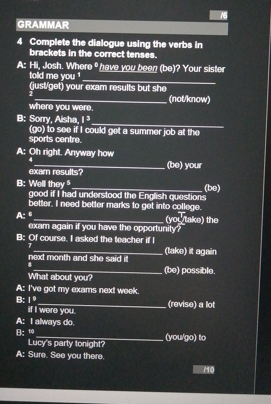 1 had just got 2 didn't know 3 went 4 were 5 would have been 6 will you take 7 could take 8 would be 9 would revise 10 Are you going