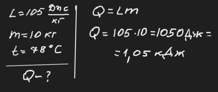 спирту 9 Питома теплота пароутворення 105 Дж/кг. При перетворенні 10 кг парів спирту, що перебувають при температурі кипіння 78 °С, в рідкий стан виділяється кiлькiсть тепла ●