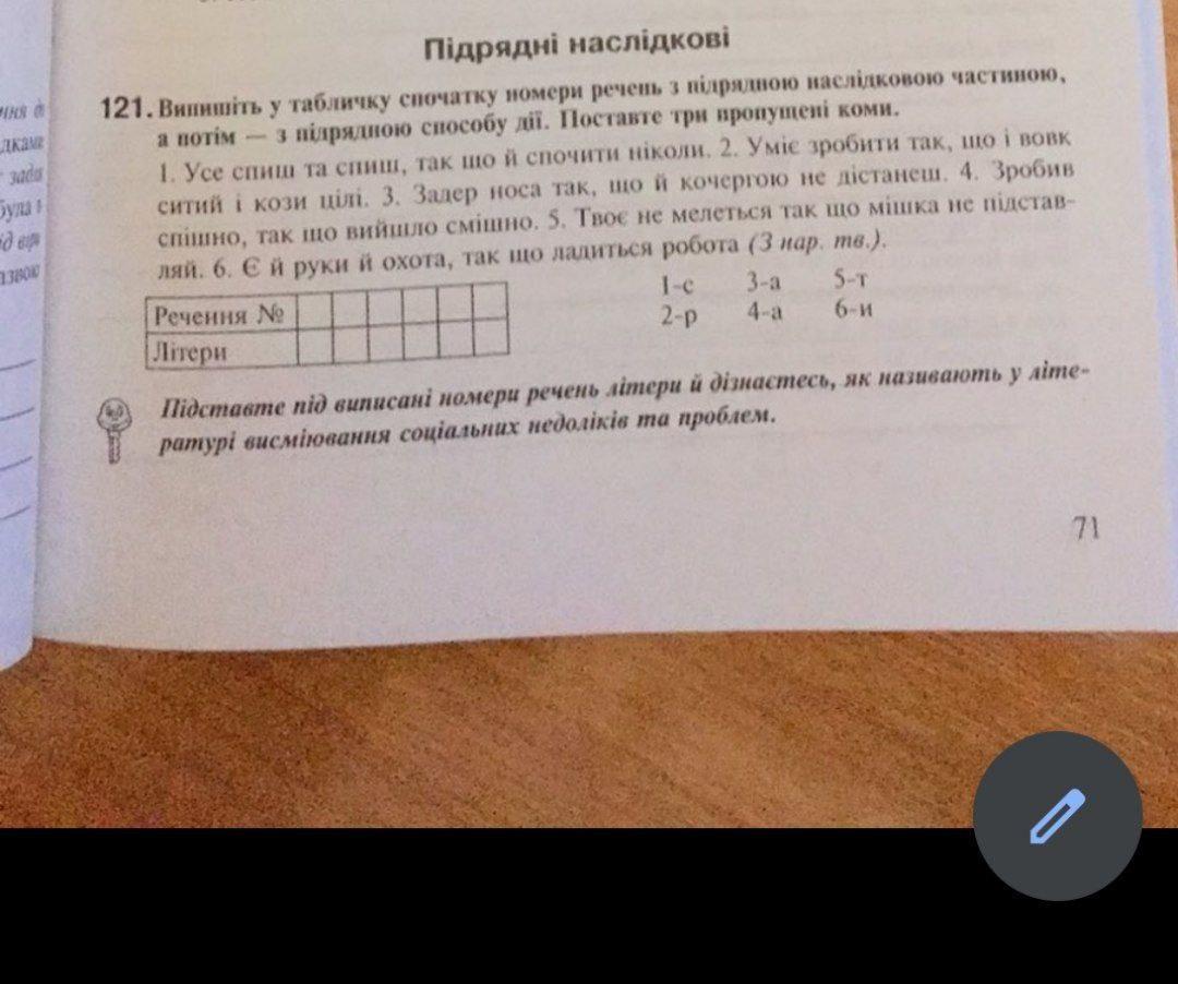 Випишіть у табличку спочатку номери речень з підрядною наслідковою частиною а потім - з підрядною способу дії. Поставте три пропущені коми.