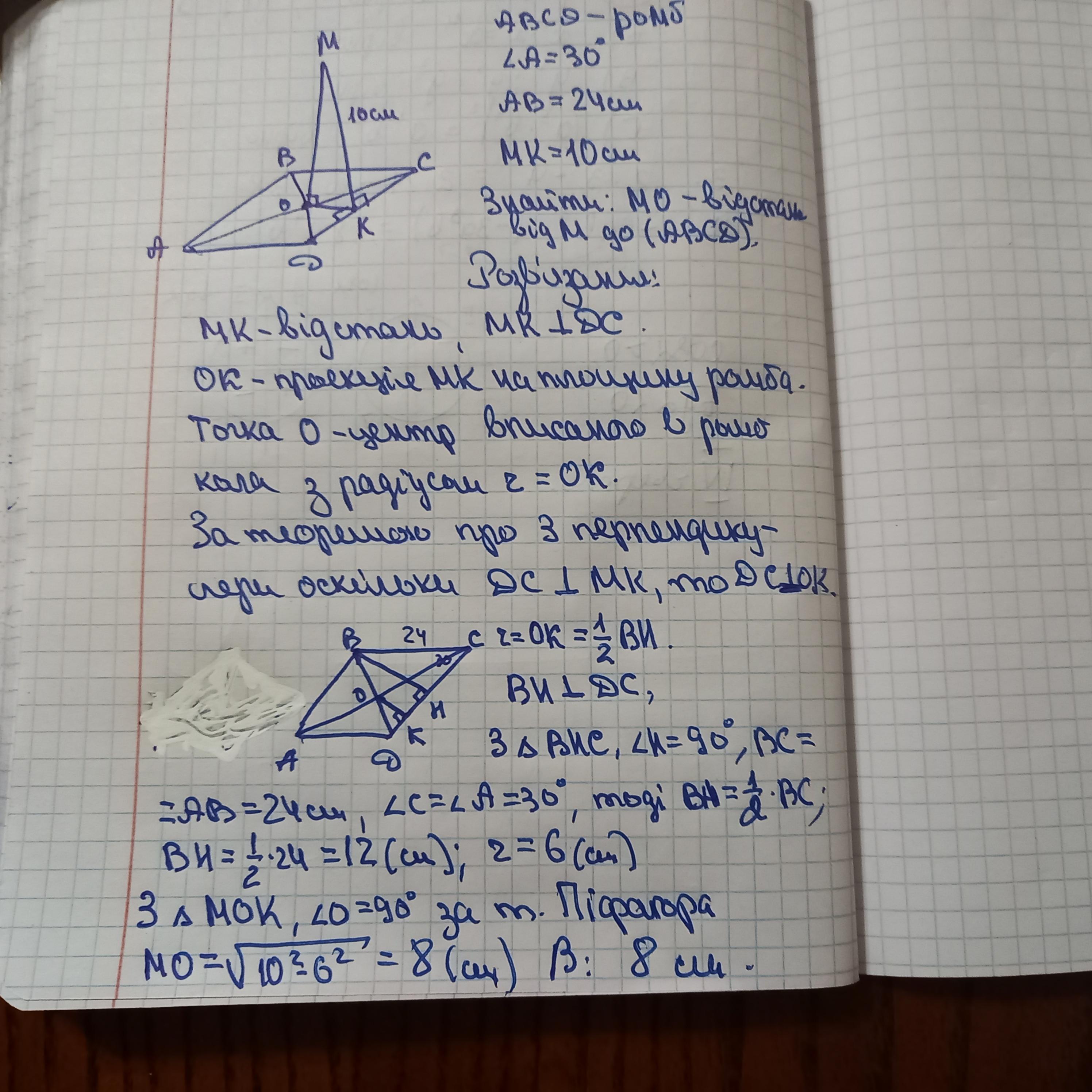 точка М зназодиться на відстані 10 см від сторін ромба АБСВ один з кутів 30 а сторона 24см знайти відстань від точки М до площини ромба
