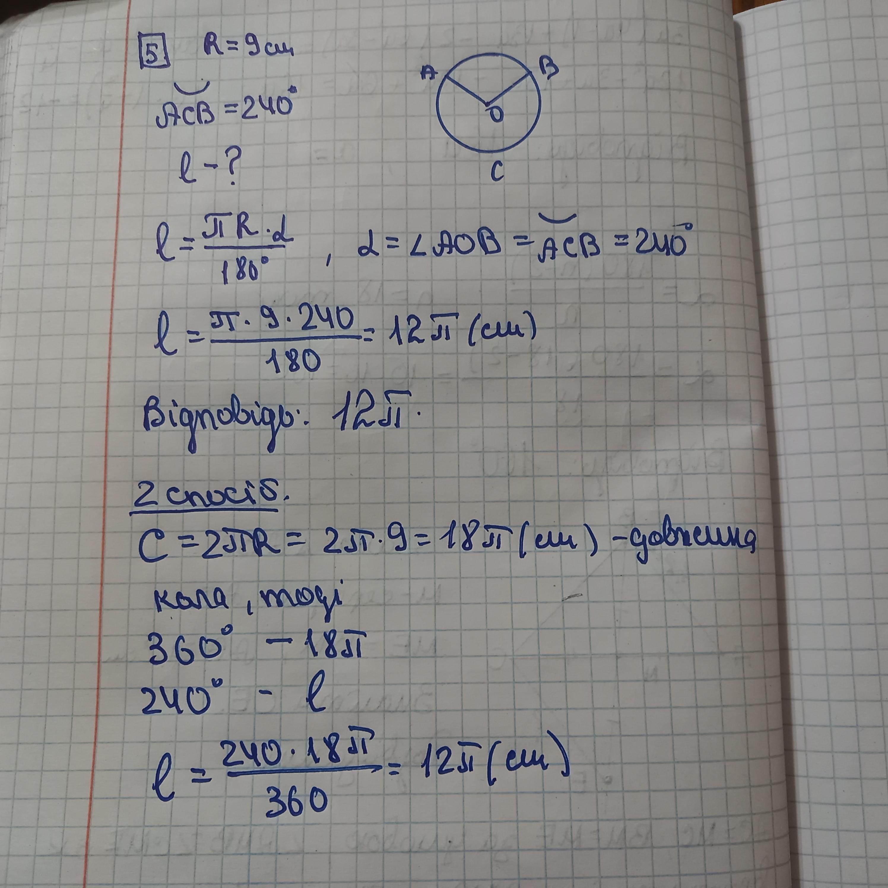 5. Радіус кола дорівнює 9 см. Знайдіть довжину дуги, градусна міра якої 240°.