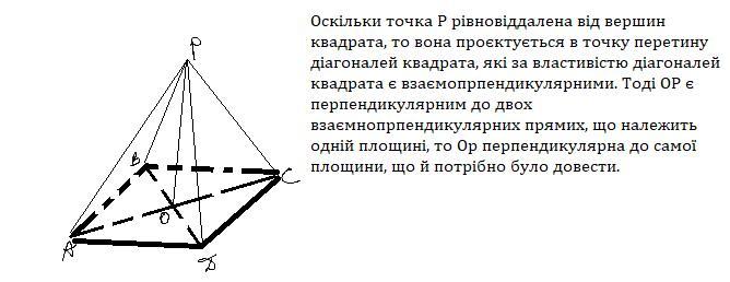 Точка P лежит за плоскостью квадрата ABCD и ровноотдпоеная от его вершини.Диагонали квадрата пересекаются в точке О. Доведите что прямая PO перпендикулярна к плоскости ABC