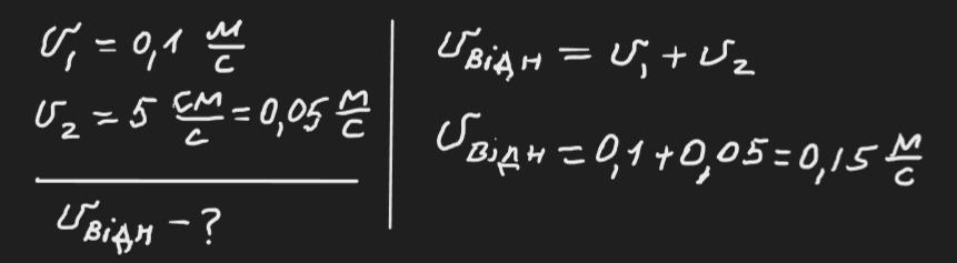 на стрічках паралельних конвеєрів рухаються у протилежних напрямках деталі одна зі швидкістю 0,1м/с друга 5 см/с відносно підлоги з якою швидкістю рухаються деталі одна відносно одної