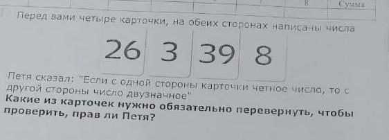 Перед вами четыре карточки, на обеих сторонах написаны числа 26 3 39 8 Петя сказал: "Если с одной стороны карточки четное число, то с другой стороны число двузначное" Какие из карточек нужно обязательно перевернуть, чтобы проверить, прав ли Петя?