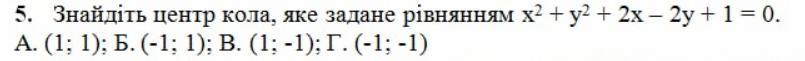 Уравнение окружности имеет вид (х-а)²+(у-b)²=R², где т. А(а; b) - центр окружности, R - радиус. Тогда, х²+у²+2х-2у+1=0. Сгруппируем слагаемые: (х²+2х)+(у²-2у)+1=0. Применим формулы (а±b)²=a²±2ab+b². (x²+2x+1)-1+(y²-2y+1)-1+1=0; (x+1)²+(y-1)²=-1+1+1; (x+1)²+(y-1)²=1; значит центр т. А (-1; 1), R=1. - это ответ Б.