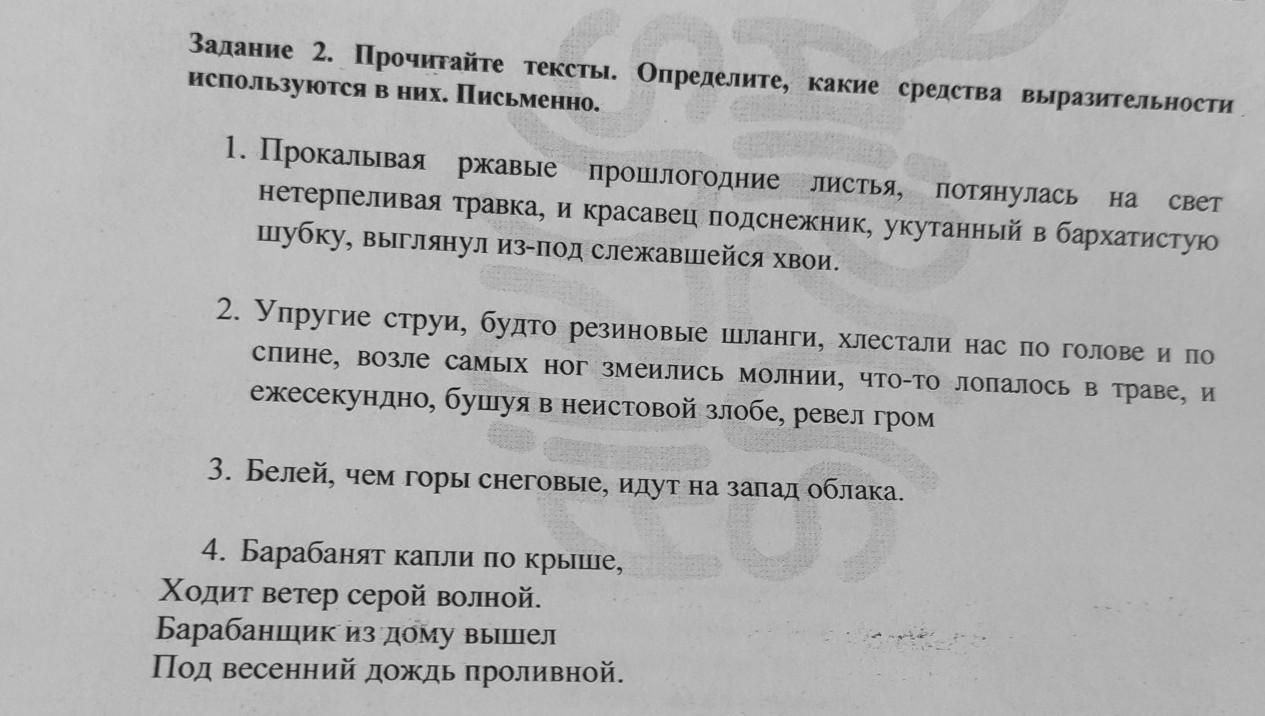 Задание 2. Прочитайте тексты. Определите, какие средства выразительности используются в них. Письменно