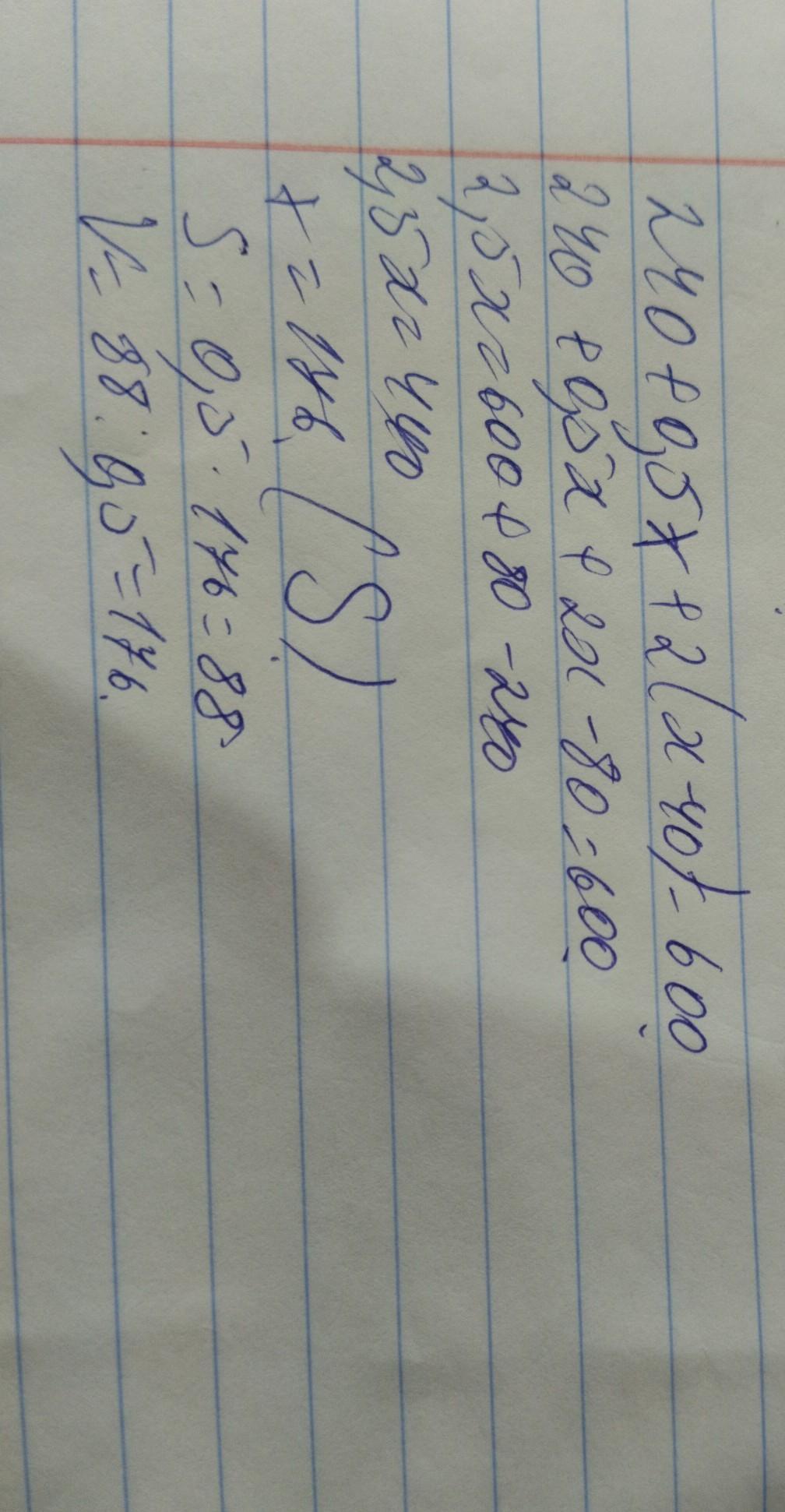 7. Cocтaвьте математическую модель для данной задачи. «Длина туристического маршрута составляет 600 км. Турист в течение 2 часов ехал на автобусе со скоростью 120 км/ч, затем двигался на самокате 30 минут со скоростьюю х км/ ч. Оставшуюся часть пути он прошел пешком за 2 часа со скоростью, которая на 40 км/ меньше скорости движения на самокате. Какова скорость движения на самокате?»