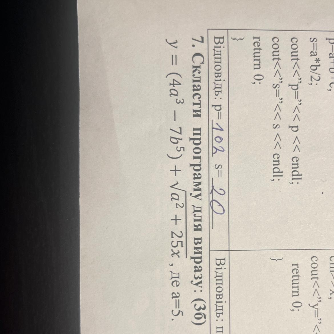 double y = (4 * pow(a, 3) - 7 * pow(b, 5)) + sqrt(pow(a, 2) + 25 * x); // расчет значения y