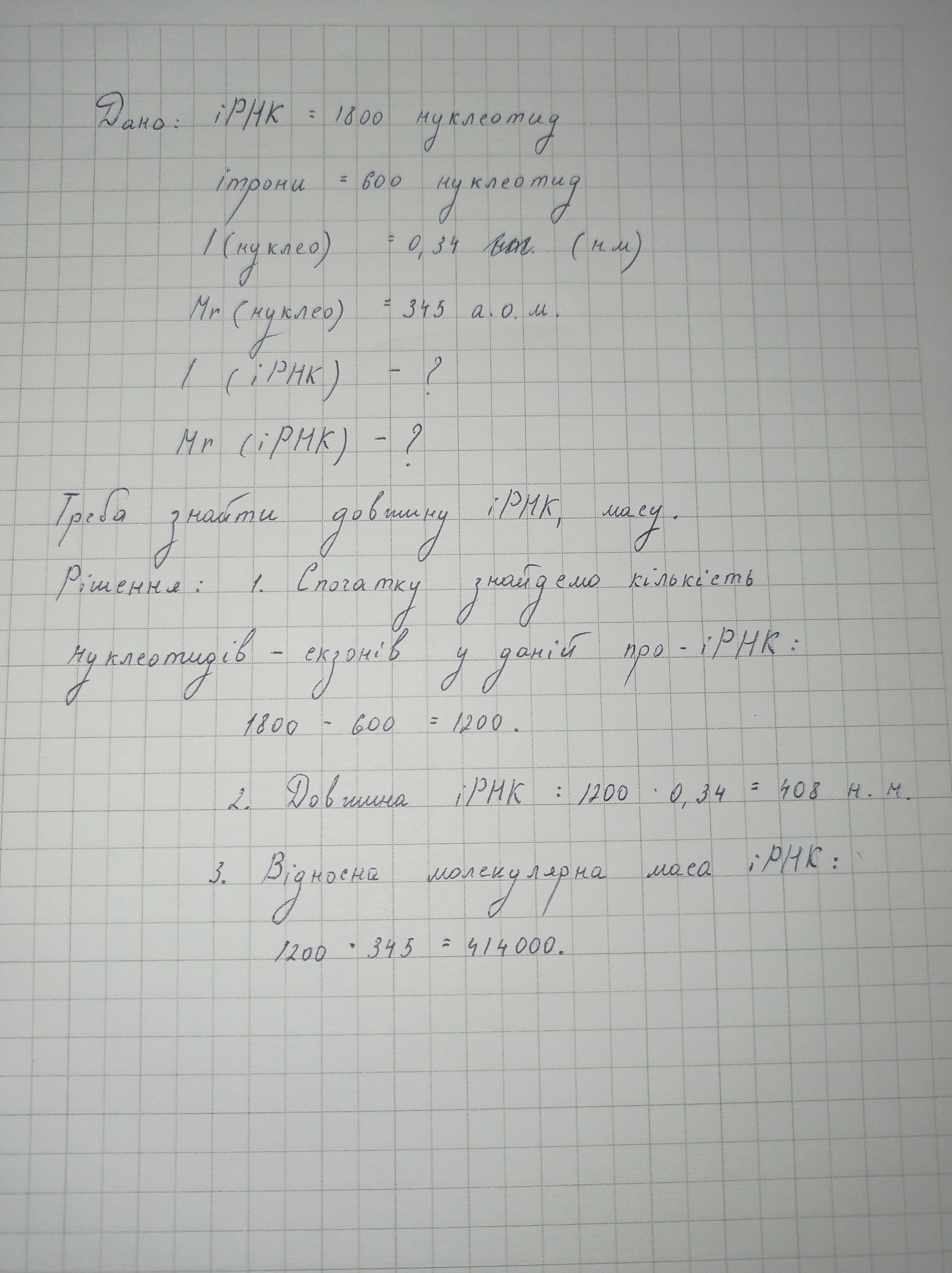 Молекула про-іРНК складається з 1 800 нуклеотидів, з яких на інтрони припадає 600 нуклеотидів. Визначте довжину і молекулярну масу зрілої іРНК.