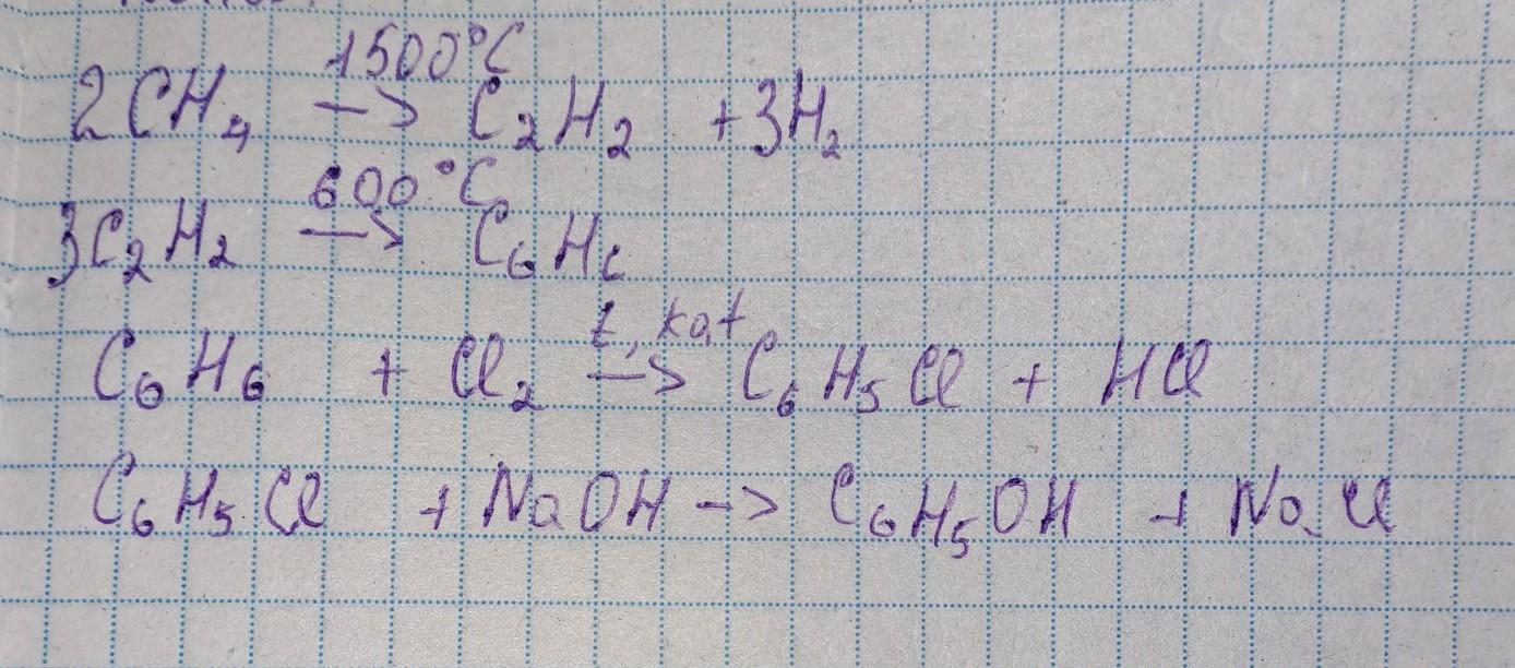 СН4 → С2Н2 → С6Н6 → С6Н5Сl → C6H5OH.