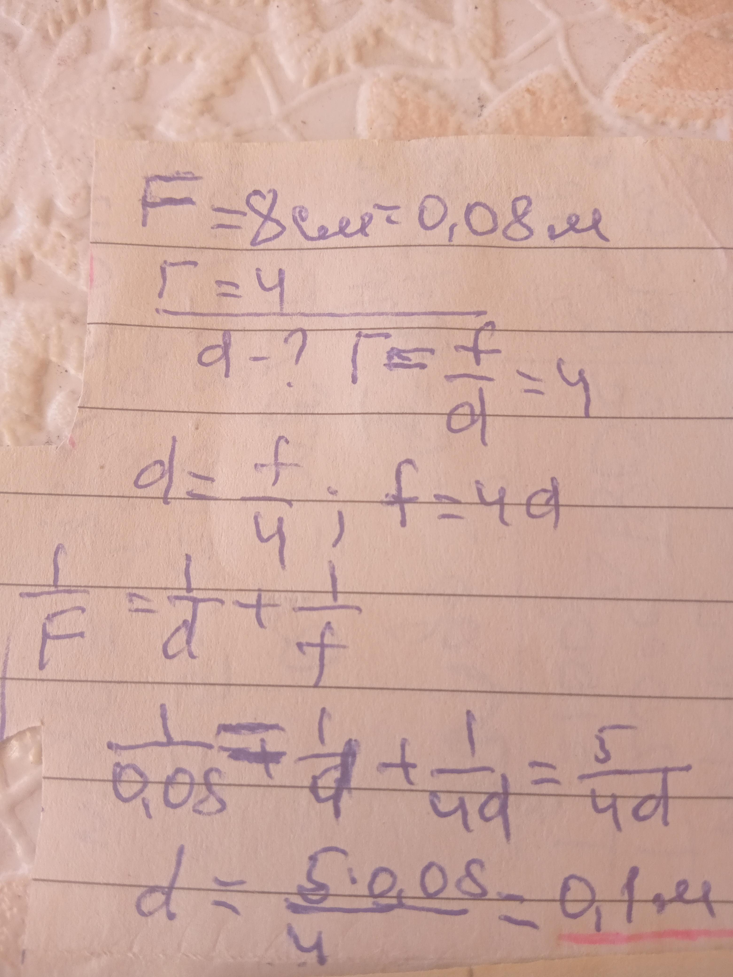 СРОЧНО, ДАЮ 50 БАЛОВ!! За допомогою лупи з фокусною відстанню 8 см отримали уявне зображення предмета. На якій відстані від лупи розміщено предмет, якщо розмір зображення в чотири рази більший за розмiр предмета?