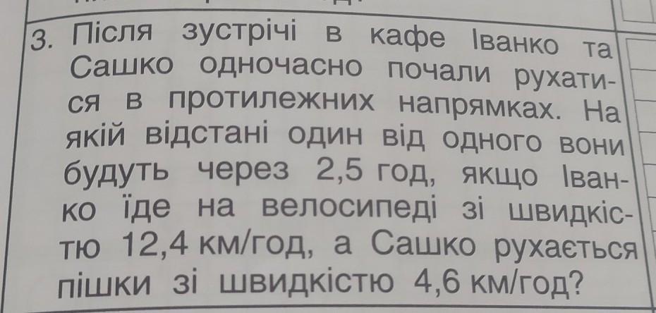 3. Після зустрічі в кафе Іванко та Сашко одночасно почали рухати- ся в протилежних напрямках. На якій відстані один від одного вони будуть через 2,5 год, якщо Іван- ко їде на велосипеді зі швидкіс- тю 12,4 км/год, а Сашко рухається пiшки зі швидкістю 4,6 км/год? -