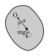 Выведем сначала выражение для частоты колебаний физического маятника. Пусть есть некоторое тело, закреплённое на неподвижной оси O, расстояние от которой до центра инерции тела равно a, и отклонённое на угол φ от положения равновесия.