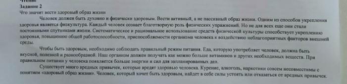 1. О чем говорится в тексте ? А) о духовном и физическом здоровье В) о правильном питании С) о вредных привычках D)об окружающей среде 2. Определите СТИЛЬ текста. А) официально-деловой В) публицистический С) художественный D) научный 3. Определите тип текста. А) повествование В) описание C) pacсуждение D) повествование с элементами рассуждения 4 Найдите предложение в котором содержится аргумент в пользу физической культуры